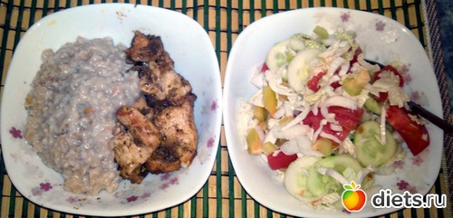 Салат заправленный маслом, соевым соусом и яблочным уксусом. Геркулес и вчерашнее куриное филе.