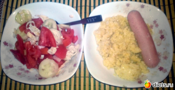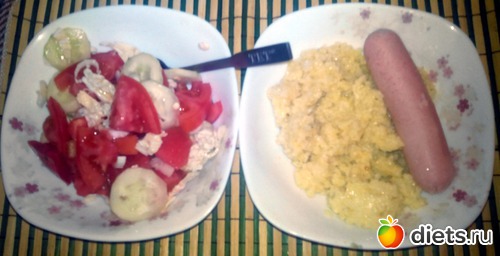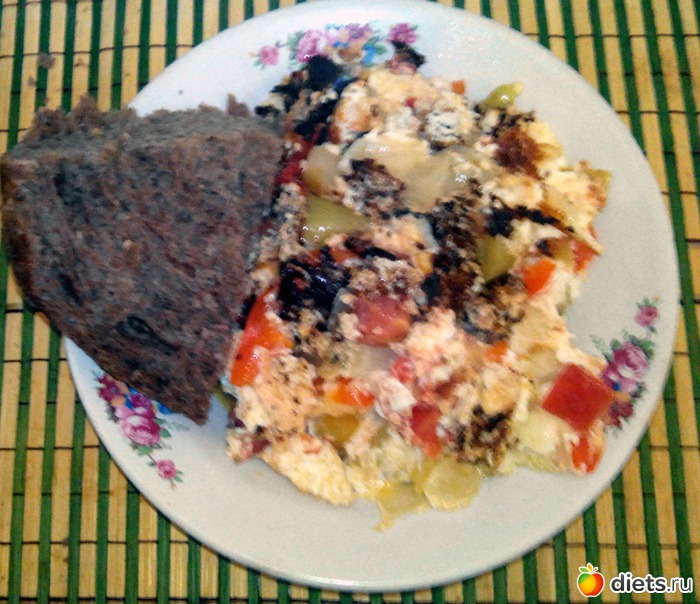 Некое подобие греческой яичницы и хлеб. Получилось так, что между первой и второй едой получился большой разрыв. Где-то часов на пять... На оптовку ходили,. за стремянкой...