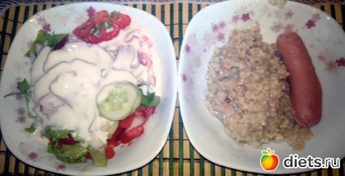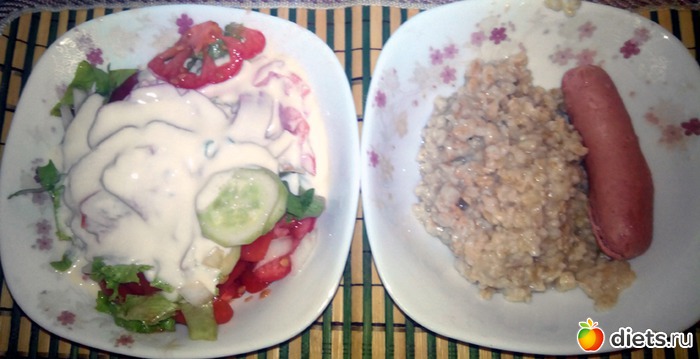 Салат, заправленный ряженкой. Геркулес и сосиска.
