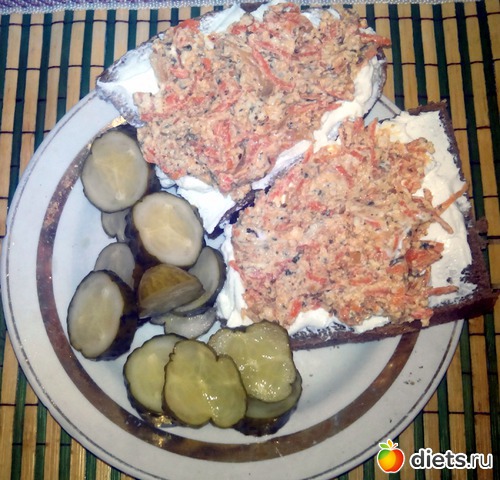 Хлеб. На хлебе греческий йогурт и сыр, смешанный с корейской морковкой. Маринованный огурец.