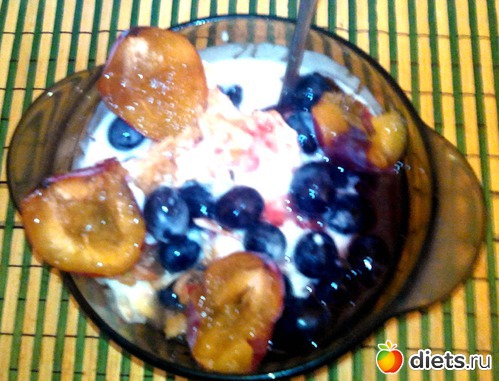 Тертое яблоко, смешанное с ряженкой, чуточку винограда, немного сливового джема (вчера на пробу баночку сварили). Ну и пара слив для завершения образа.