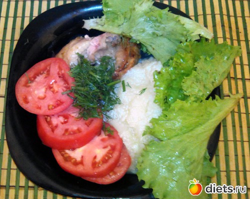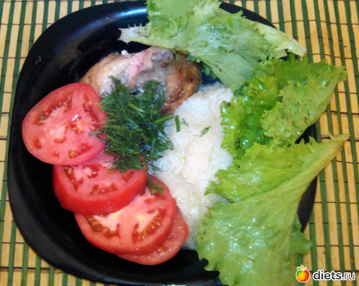 Картофельное пюре, куриное бедро, помидорка и салат.