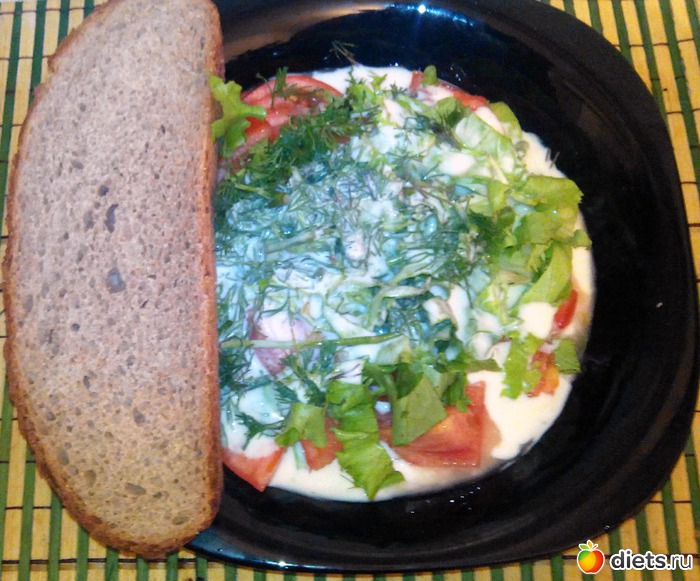 Салат из помидорки, салата и укропа. Заправлен ряженкой. И кусочек хлеба.