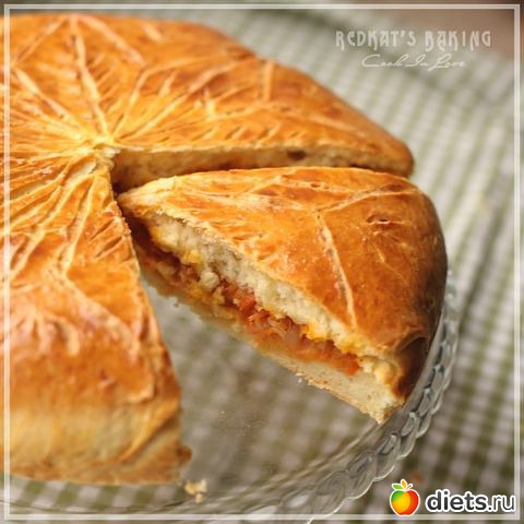 Тесто раскатать, выложить в форму, сделав бортик, уложить сверху начинку.