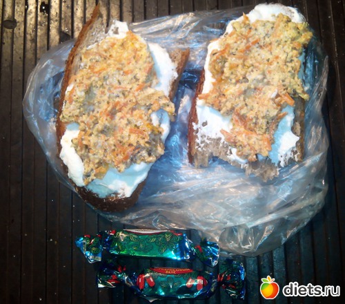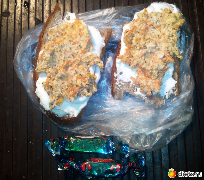 Хлеб. На хлеб намазан самодельный греческий йогурт и смесь колбасного сыра и корейской моркови. Две желейные конфеты.