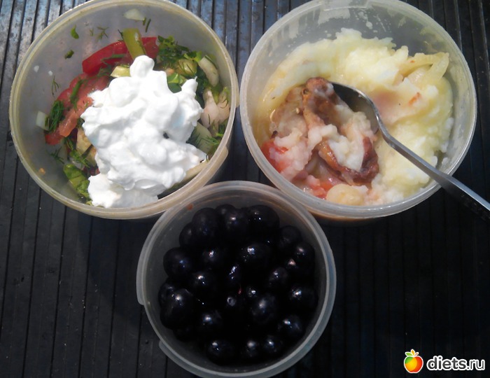 Салат с заправкой из греческого йогурта. Картофельное пюре с бедрышком. Виноград.