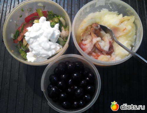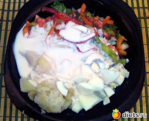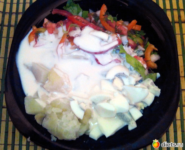 Салат, вареный картофель и яйцо. Заправлено ряженкой. Вообще диетическая еда по пропорциям вышло!