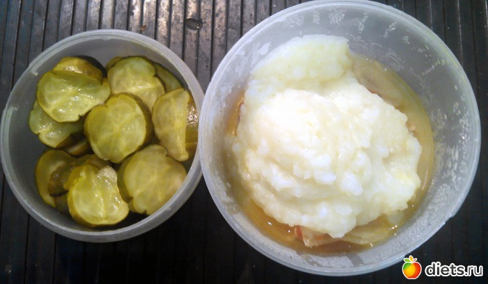 Маринованные огурцы. Они кончились!!! И еще одна порция пюре с бедрышком.