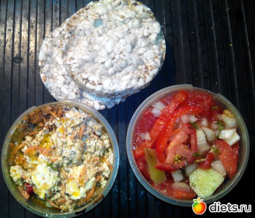 Салат, заправленный соевым соусом и подсолнечным маслом. Хлебцы. И нечто, что можно назвать "жареный творог". Получилось так, что некоторое количество творога несколько "задумалось" и требовалось его спасти. Поэтому я разогрел сковороду, положил на нее творог, посолил, добавил чуточку подсолнечного масла и укропа. Дождался, когда испариться почти вся сыворотка и выключил огонь. Собственно, все. Когда остыл - положил в баночку.