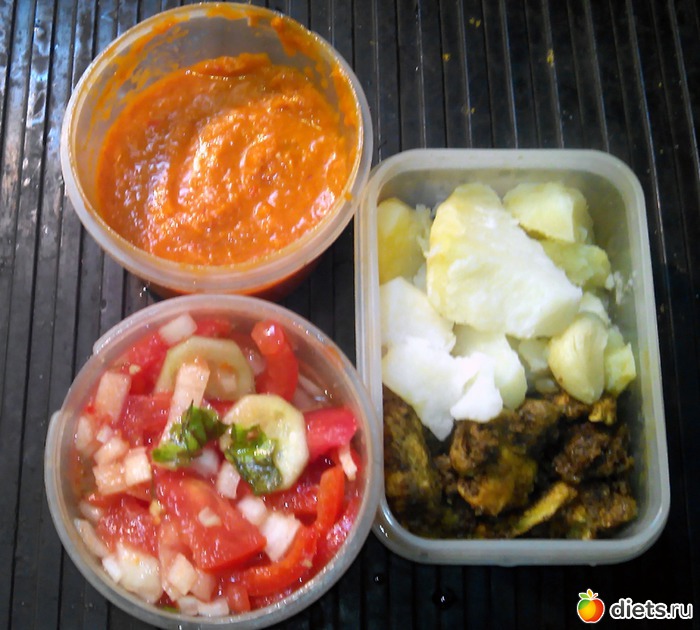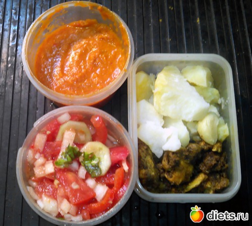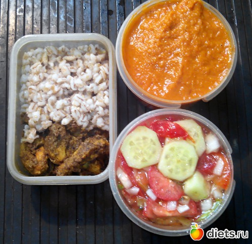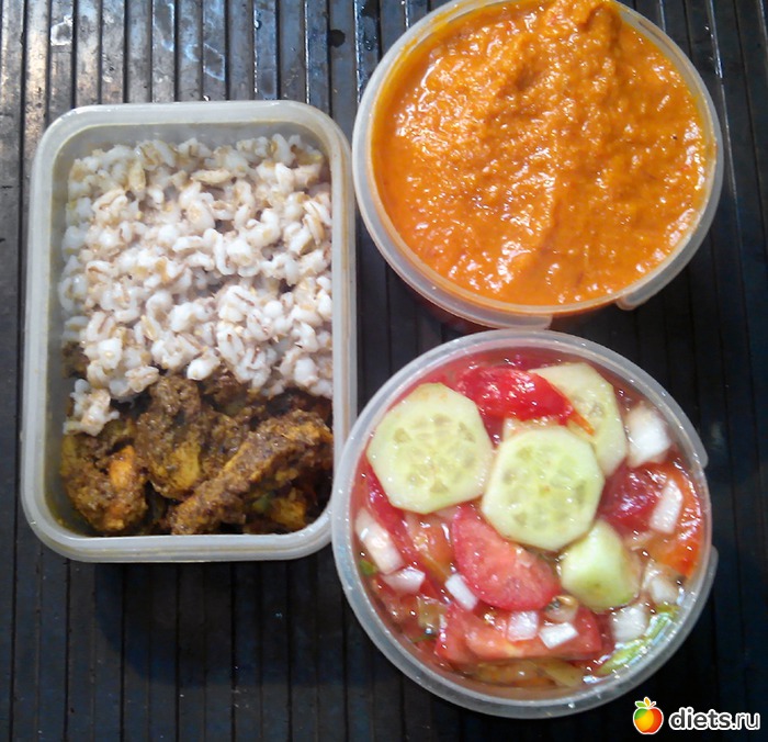 Вчерашняя соус-икра. Салат. Перловка и жареное куриное филе. Панировка, однако, не понравилась.