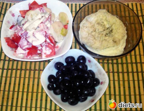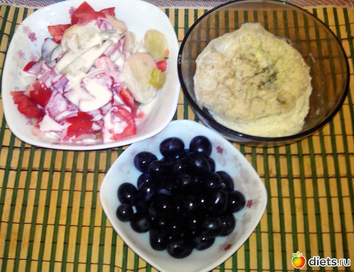 Салат с ряженкой. Нечто вроде омлета из микроволновки. Виноград.
