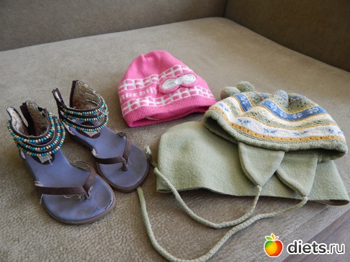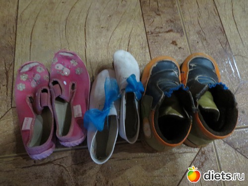 выкинула три пары дочкиных старых маленьких и потертых :чешки, тапочки, ботиночки
