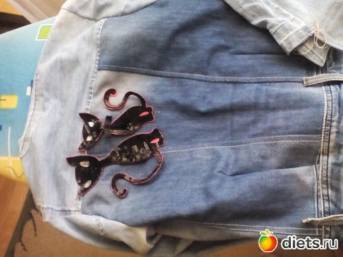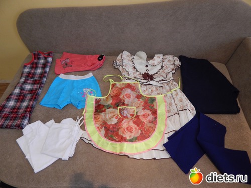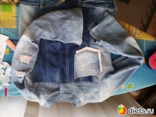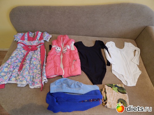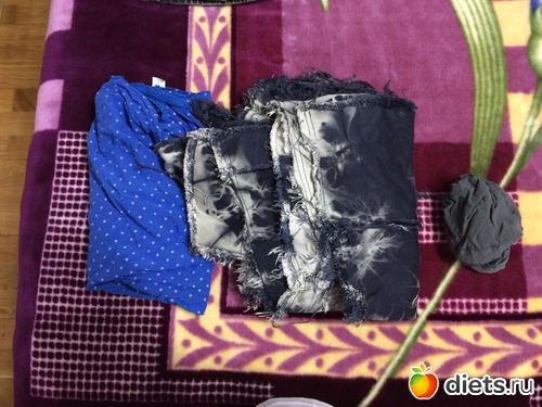 порватая футболка дочки, халат мой, 2 пары джинс порватых (вырезала из них для курточки кусочки) , сдувшийся мячик и кувшин который мен не нра
