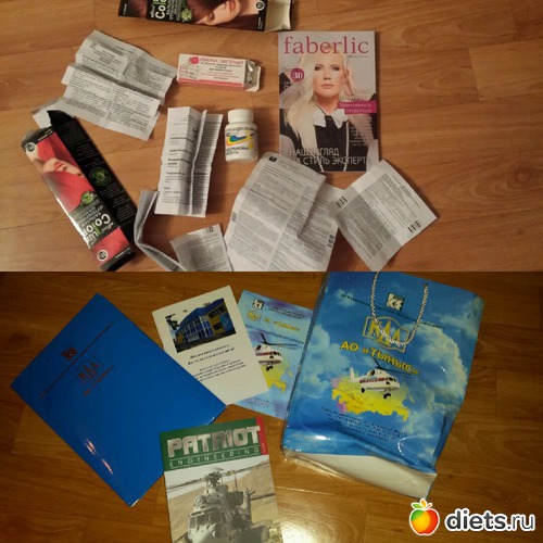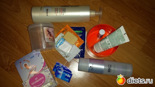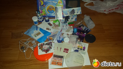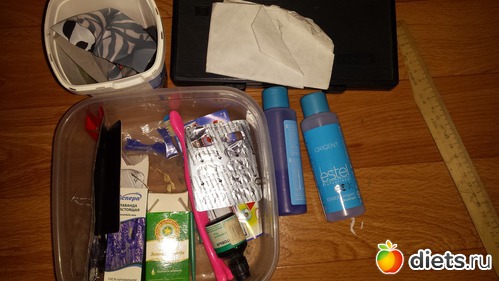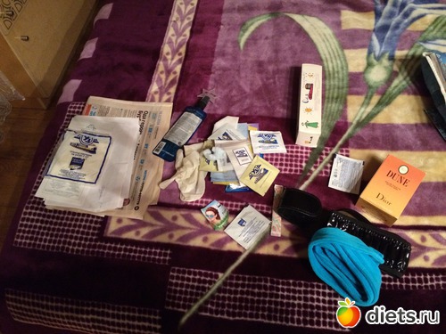 Пустой флакончик от духов, куча пробников и салфеток, просроченное стайлинговое средство, коробка старых использованных зубных щёток, пояса не нужные.
