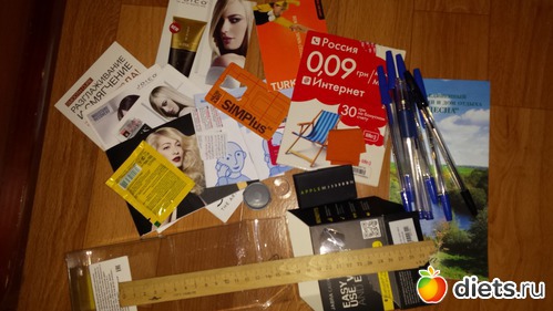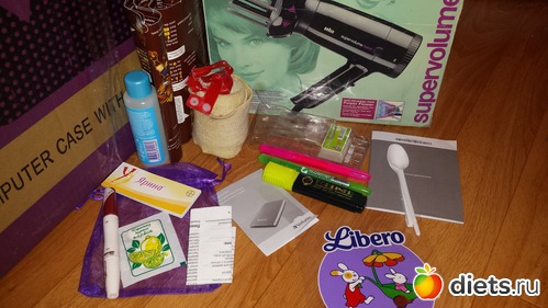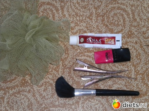 Старая мочалка (неосмотрительно познакомила ее с кофейным скрабом), 2 затрапезные заколки для волос, неизвестно как попавшая ко мне кисть для пудры никакого качества, тушь эйвон (была подарена неизвестно кем с неизвестной целью - обычно пользуюсь японской), тюбик хны для мехенди (с ним мы не смогли найти общий язык и вообще друг друга не поняли).