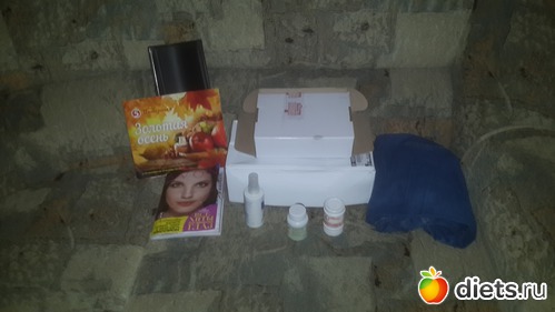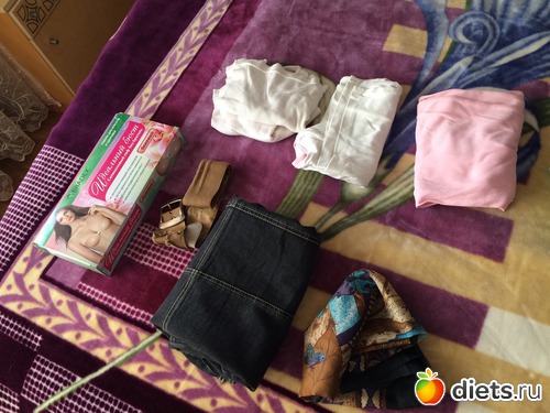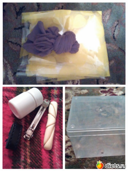 Колготки, упаковочная бумага, какой-то контейнер, заколка, флакончик от таблеток и фиговина от ремня - на выброс