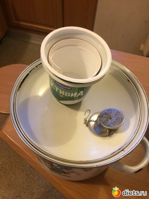 Старая эмалированная кастрюля, 3 пустых стаканчика и ситечко для чая