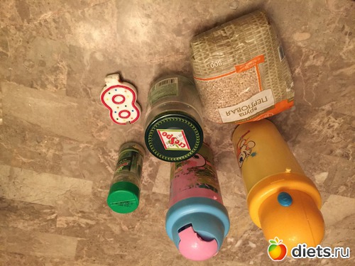 2 бутылки для воды дочкины (сломанные, испорченная резьба и тп), баночка от специй , банка, просроченная крупа, свечка - цифра8, на днях праздновали день рождение дочи 8 лет. Дочь заботливо предложила хранить свечку до её восемнадцатилетия , сказала : купишь через 10 лет свечку- цифру 1 и будет 18