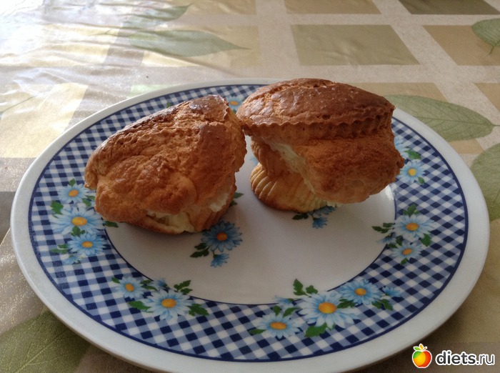 Это мой профитроль...) остались крошки и внутреннее тесто, я его покрошила и слоями разложила: крошки, малина, крем, опять крошки, малина, крем...) это был мой десерт...) а Моему обычной формы пироженки...
