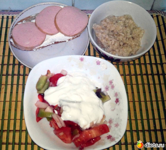 Салат с йогуртом. Геркулес. И хлеб с греческим йогуртом и колбасой.