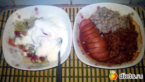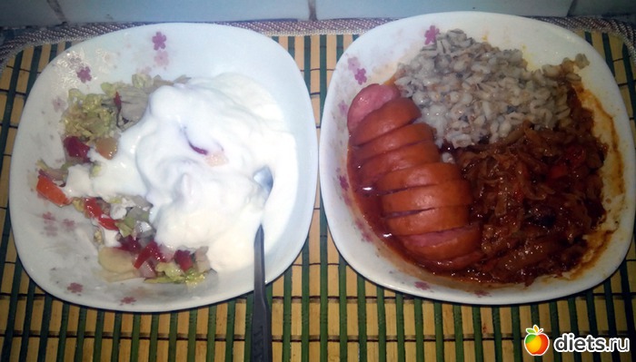 Салат с йогуртом. Тушеная капуста, перловка и сарделька. Для начала мне было довольно голодно. А когда поел, то понял, что пора от такого сочетания отказываться. Как-то не очень хорошее послевкусие вышло. Хотя от сарделек отказываться не собираюсь. Только в сочетании с салатом.