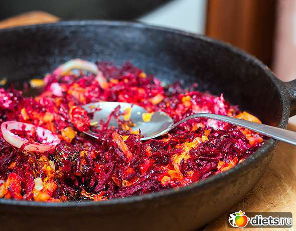 Овощи очистите и вымойте, морковь и свеклу измельчите на крупной терке или в комбайне, лук нарежьте полукольцами. На растительном масле сделайте зажарку, за 10 минут до готовности добавьте мелко нарубленную петрушку (можно заменить ее майораном или кинзой), а за 5 минут до конца жарки влейте уксус.