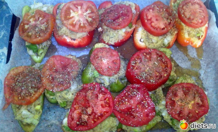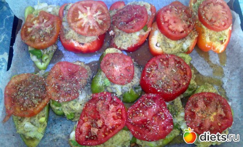 Натер картошки, смешал с луком и яйцами, посолил и в перцы! А сверху кусочки помидор. И в духовку.