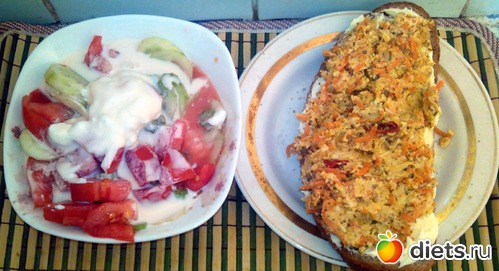 Поэтому сделал я себе свой классический бутер с греческим йогуртом и намазкой из сыра с корейской морковью. Плюс салат с простым йогуртом.
