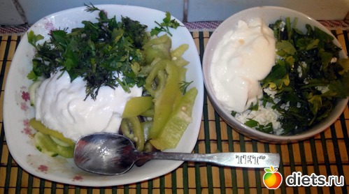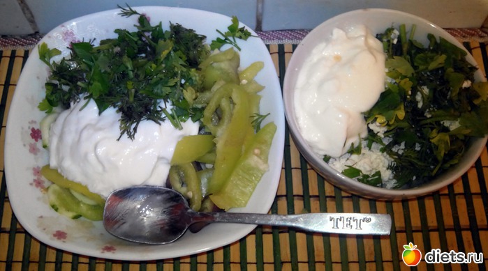 Салат из огурцов, перца и зелени с йогуртом. Творог с зеленью и йогуртом.