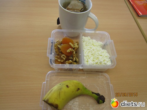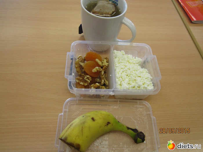 2. творог 100 грамм, 4 кураги, 5 грецких орехов, пол банана, чай