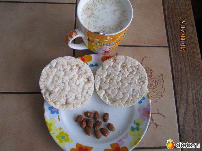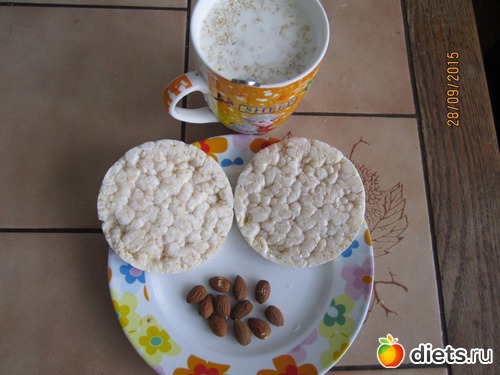 3. кефир, 1 чайная ложка отрубей, 2 хлебца, 10 штук миндаля