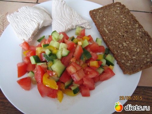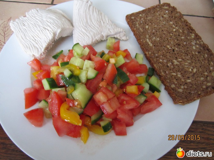 4. вареная куриная грудка 200 грамм, салат (помидор, огурец, сладкий перец, оливковое масло), хлеб