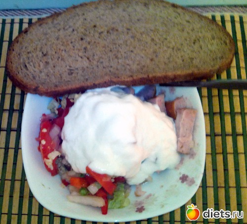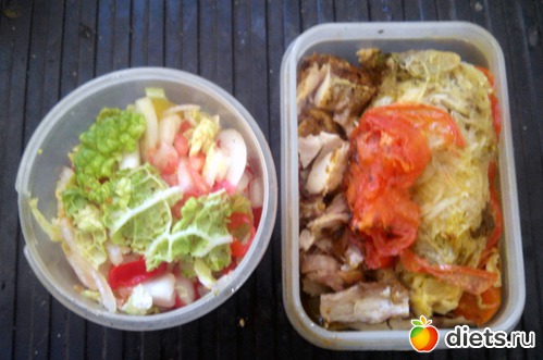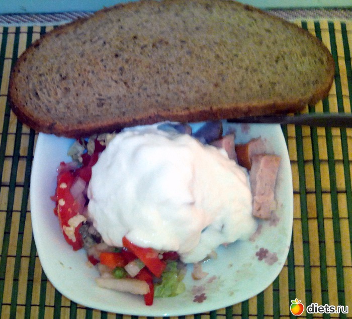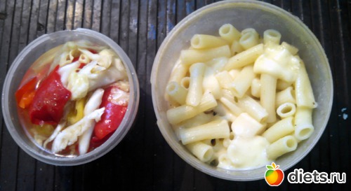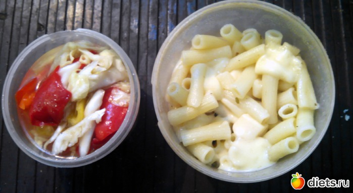 Вот тут, увы, было некоторое количество маринованных капусты и перца, плюс макароны с сыром. Но тут маринад вполне оправдан. Дело в том, что кислоты замедляют усвоение быстрых углеводов и нет риска поднять сахар.