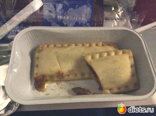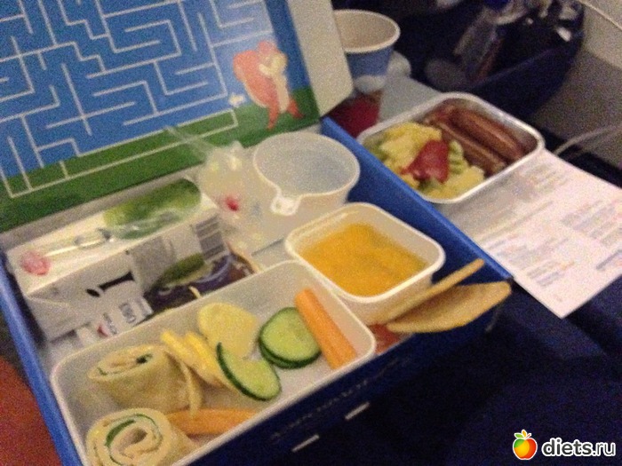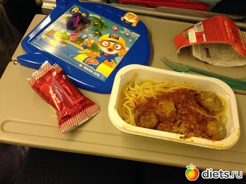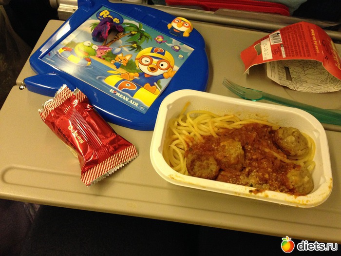 Опять есть. Детское: спагети с фрикадельками (оч вкусные, кстати, макароны мне не достались), брауни, пудинг, салат с ветчиной и крабовыми палками, кажется, сок апельсиновый.