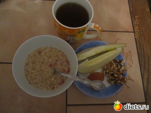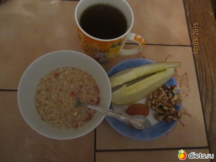 1. овсяная каша с клубникой, 2 кусочка дыни, грецкие орехи, курага, чай