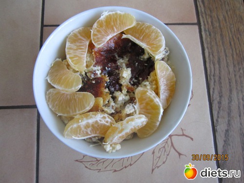 2. творожная запеканка (она правда вся развалилась, когда накладывала), мандарин