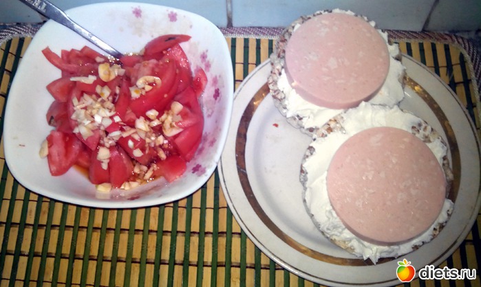 Помидоры с чесноком, соевым соусом, яблочным уксусом и подсолнечным маслом. Хлебцы. На них греческий йогурт и колбаса. Не очень понравилось это сочетание. Хотя использовать слайсы как основу для бутеров вполне возможно, только намазка должна быть достаточно выраженного вкуса, иначе вкус фанеры никак не перебить.