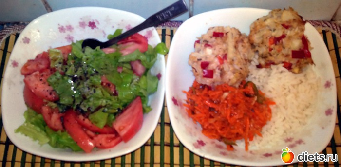 Помидорка с зеленым салатом, заправлено соевым соусом, яблочным уксусом и подсолнечным маслом. Рис, корейская морковь и нечто вроде котлеток из куриного фарша, лука, перца. Добавил еще остатки старого творога, который стал уже залеживаться. Все смешал, добавил соль и специи, разложил по формочкам и в духовку. Вышло неплохо.