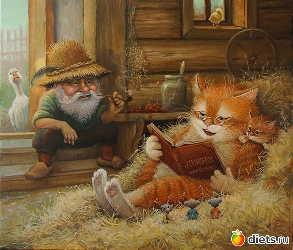 Кот ходит по дому как дембель. Собакевич обращается к нему не иначе, как «Товарищ Старослужащий». Тот за это отдаёт ему масло.