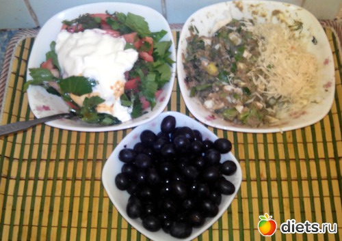 Настроение было по-импровизировать, И потому соорудил нечто вроде паштета из хумуса, яйца, зелени... а вон то белое и мелкое это не сыр, а тертый корень сельдерея. И все смешать! Салат из помидорки, зелени и йогурта и виноград. Порции кажутся большими, но на самом деле - помидорка грамм на двести. Хумуса грамм сто... Яйцо грамм пятьдесят...