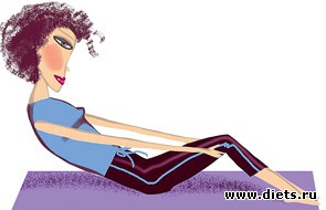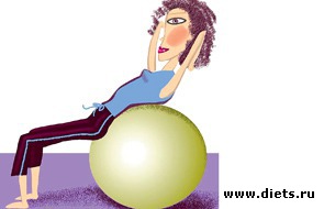 Сядьте на гимнастический шар. Поставьте ноги как можно дальше, так чтобы нижняя и средняя часть спины покоились на шаре. Сцепите руки за головой, раздвинув локти в стороны. Напрягите мышцы живота. Вдох - оторвите плечи от шара, затем снова опустите. Повторяйте в течение 30 секунд или минуты, не расслабляя живота и не отрывая спины от шара.