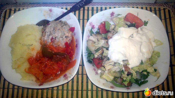 Салат с йогуртом. Картофельное пюре, котлета из куриного фарша с луком и болгарским перцем. Плюс немного домашнего лечо.