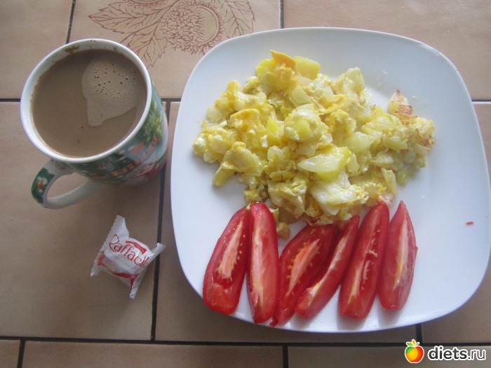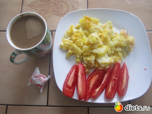 1. яичница (лук, картофелина, яйца), помидор, кофе