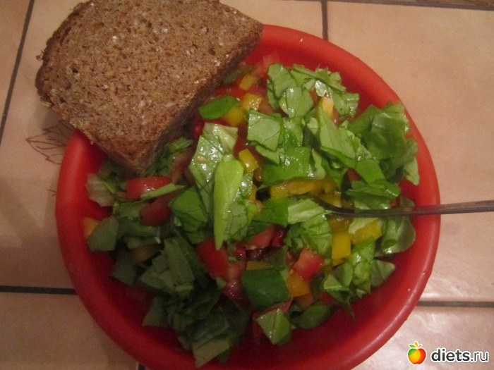 4. салат (листовой салат, помидор, сладкий перец, оливковое масло), хлеб