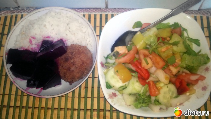 Салат с той же заправкой. Рис, котлета и отварная маринованная свекла.