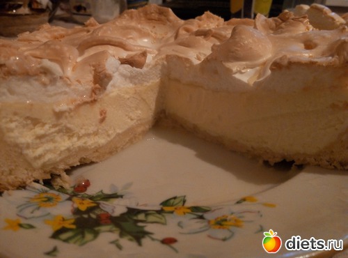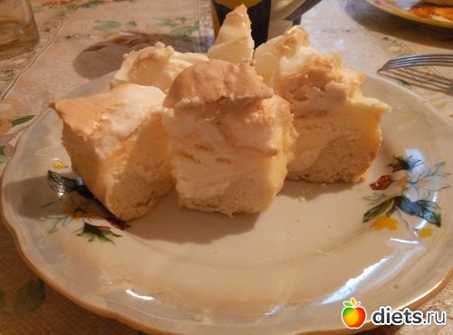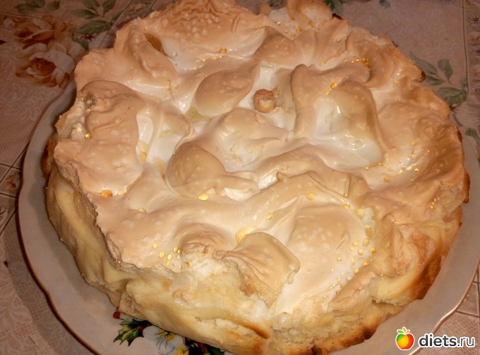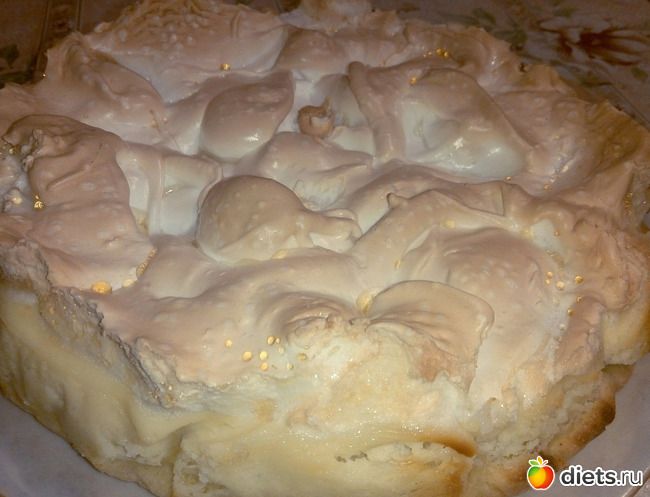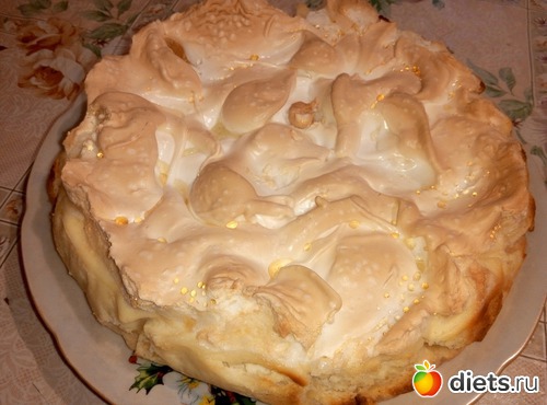 Ложкой или с помощью кулинарного мешка выкладываем на творожный слой белки, взбитые с сахарной пудрой. Ставим готовиться в горячую духовку еще минут на 15.