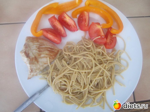 2. спагети коричневое, индейка жаренная, помидор, перец