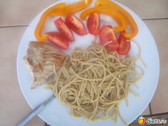 2. спагети коричневое, индейка жаренная, помидор, перец