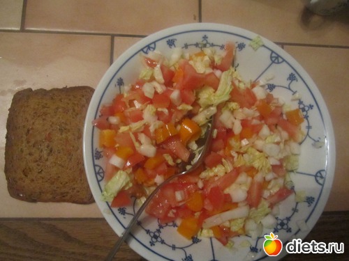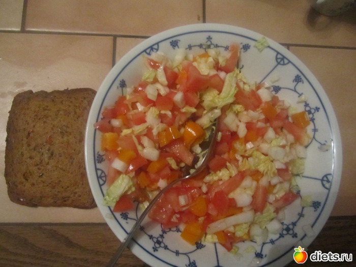 3. салат (пекинская капуста, помидор, сладкий перец, оливковое масло), хлеб белковый