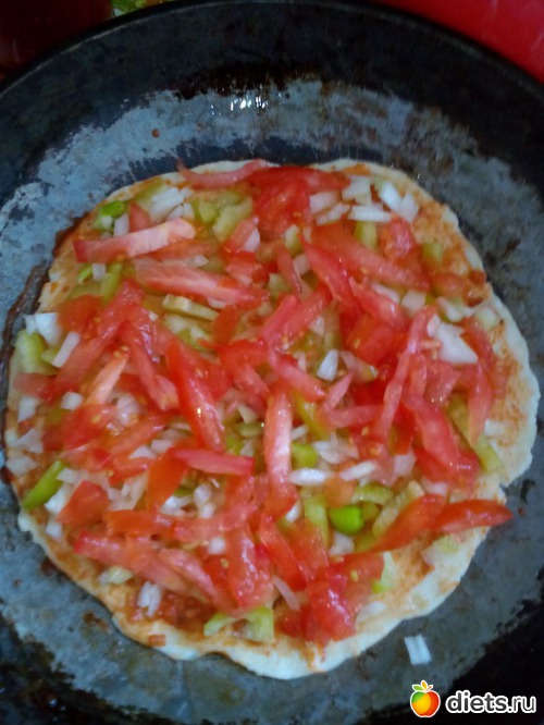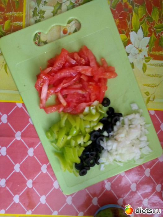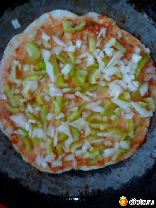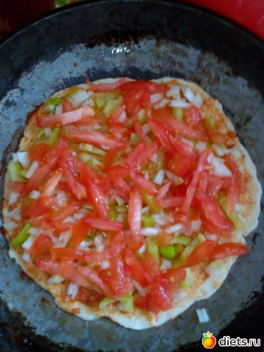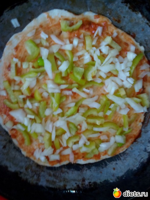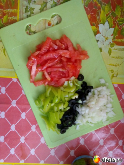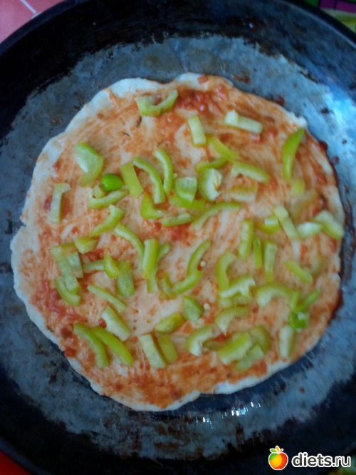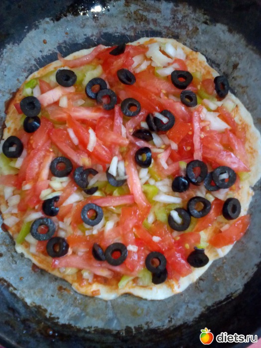 4)Смазываем соусом(у меня "Кухмастер. Татарский", Далее выкладываем начинку-перец, лук, помидор, маслины. Подсолим